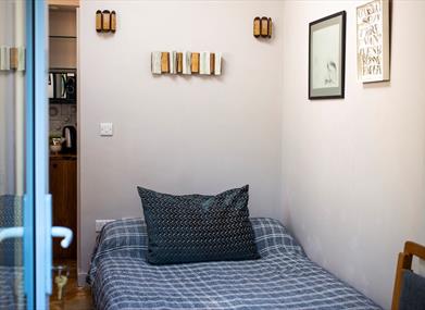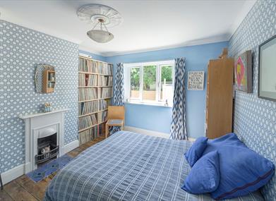 The Gallery Room, in a separate building in the garden, functions as a white cube gallery space when occasional exhibitions are on. It is a bijoux self-contained studio with en-suite Bamboo Bathroom. It has a double bed, mini-kitchenette, underfloor heating and a small conservatory. It has its own terrace with French doors leading to the Blackberry Hill patio and its own street entrance. Amenities include: flat-screen TV, fridge, microwave, kettle, toaster. Pets are welcome.