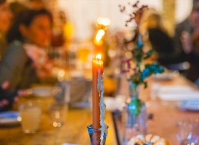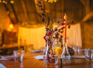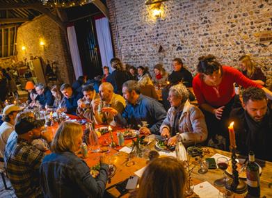 Arrive in the crisp country air to the scent of woodsmoke, outdoor fires and the soft warmth of a winter cocktail. As dusk settles beyond the South Downs, you step into a centuries-old Sussex barn alive with the glow of open flames. Long tables set for communal feasting. Fires crackling. Glasses raised.