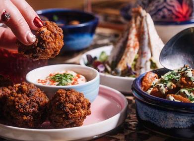 Our menu features nibbles and small plates of all flavours, from our famous cheesy dumplings, Algerian Lamb sausages, vegan spiced aubergine stew, or rosemary fries, as well as our infamous tagines made from family recipes. Plenty of plates to indulge in with friends!