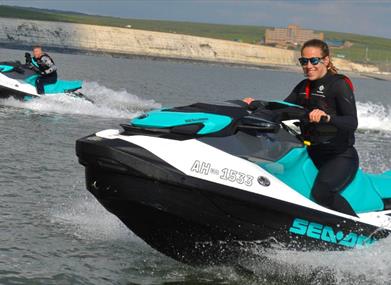 Drive your own Personal Watercraft (Jet Ski) and enjoy the acceleration and high speed experience whilst moving along the Brighton coast. Our qualified instructor will lead the session and guide you out of the marina before setting a zone for you to go and play on both your tight and high speed runs. Each ski can take up to 2 people (second person is charged £20). 60 minutes including safety briefing and tuition. Must be age 17 + to drive. Skis are the latest Seadoo 135 GTI’s. Check web site or call for availability.