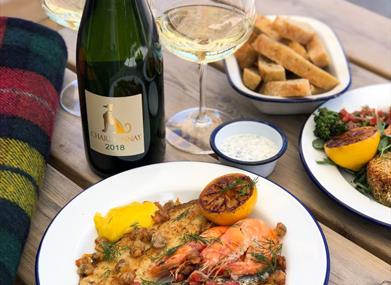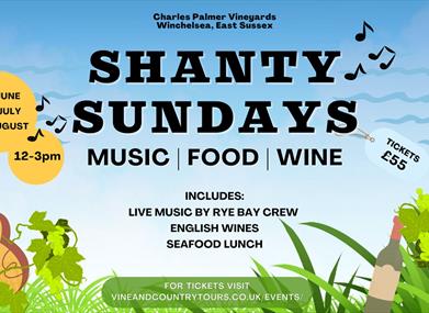 Back by popular demand our Shanty Sundays return to kick off your Sunday Sesh in raucous style with a celebration of local seafood, wines and live Sea Shanty music. A chance to soak up the atmosphere of an English vineyard, taste fabulous wines and lunch heartily with friends and family, whilst basking in the summer sun and the music plays.<br /><br />Our set lunch menu will be a medley of local seafood grilled whole and served with delicious sauces, side dishes, roasted new potatoes and our in house focaccia. Or select our mouthwatering vegetarian menu at checkout featuring halloumi fries, griddled vegetables, miso and nori "fish" cakes and pea purée.<br /><br /><strong>What's Included with your ticket:</strong><br /><ul><li>2 x glasses of CPV Chardonnay 2019 per guest or bottle per couple</li><li>Menu: Local seafood platter and grilled vegetables, roasted new potatoes, aioli and house baked bread. (Or select our mouthwatering vegetarian option during checkout)</li><li>Live sea shanty music by the very popular Rye Bay Crew</li><li>Self-guided tour of the vineyard</li></ul><br /><br /><br /><strong>IMPORTANT INFORMATION – PLEASE READ BEFORE BOOKING:</strong><br /><ul><li>Pre-booking is essential. To help us prepare the right ingredients and limit food waste, we ask for full payment for your meal in advance.</li><li>Each £55 ticket includes a booking fee which is non-refundable as this goes towards administration costs and payment provider fees. However, we understand that there may be occasions where you need to cancel and would appreciate as much notice as possible.</li><li>Cancellations over one week in advance will receive a full refund minus the booking fee. Any cancellations made less than one week in advance may be eligible for a partial refund if we are able to resell the tickets.</li><li>After booking, please check your confirmation email immediately and notify us if any details are incorrect.</li><li>We will always try to cater for all dietary requirements and there will be a vegetarian/vegan option available. Please mention when making your booking or contact us prior to the event to inform us of your needs.</li><li>Children over 5 are welcome but please note, a full price ticket will need to be purchased.</li><li>The cellar door bar will be open and we accept card or contactless payments only please. Please note, this is not a BYO event.</li><li>Physical tickets are not issued; you will be asked for your booking name on arrival.</li><li>Well behaved dogs welcome but they must stay on a lead whilst on premises.</li></ul><br /> <br /><strong>Inclusions</strong><br /><strong>What's Included</strong><br />🍴 <strong>Food</strong> - Set menu seafood lunch of 3 dishes plus house baked bread<br />🥤 <strong>Drink</strong> - A glass of CPV Chardonnay 2018 or a bottle per couple<br /> <br /><strong>What you'll need</strong><br />🧤 <strong>Warm Clothing</strong> - Dress appropriately to the weather and the countryside. Footwear suitable for strolling through the vines is probably a good idea.<br />📋 <strong>Other</strong> - Be sure to bring your appetite and smiles from ear to ear<br />