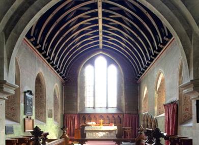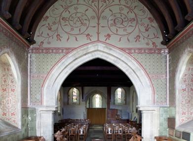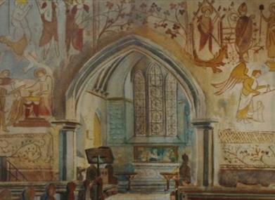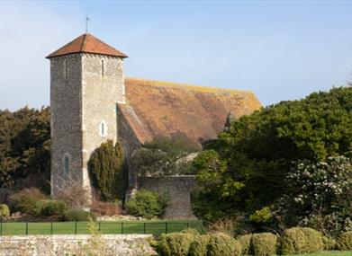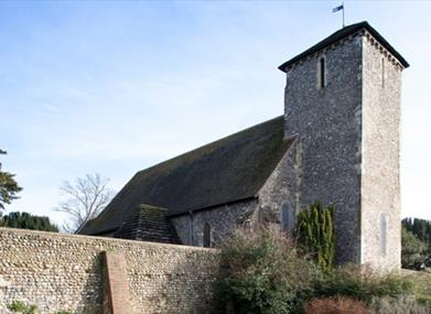 This simple square-towered church, built from flint rubble, is 800 years old. It stands in the beautiful landscaped park of Preston Manor. Now all looks serene but in 1906 the church was damaged by fire and nearly lost its greatest treasures - its fourteenth-century wallpaintings.